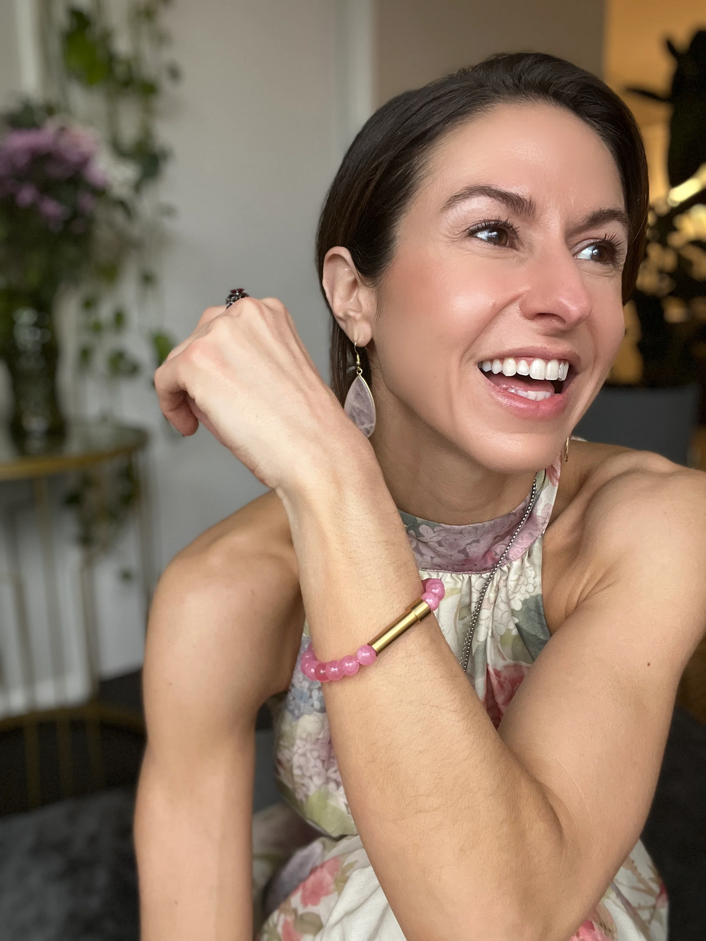 Crafted with genuine rose quartz – a stone cherished for its heart-healing and love-attracting properties – this bracelet not only amplifies your affirmation but clears away any energetic blocks standing between you and your dreams.